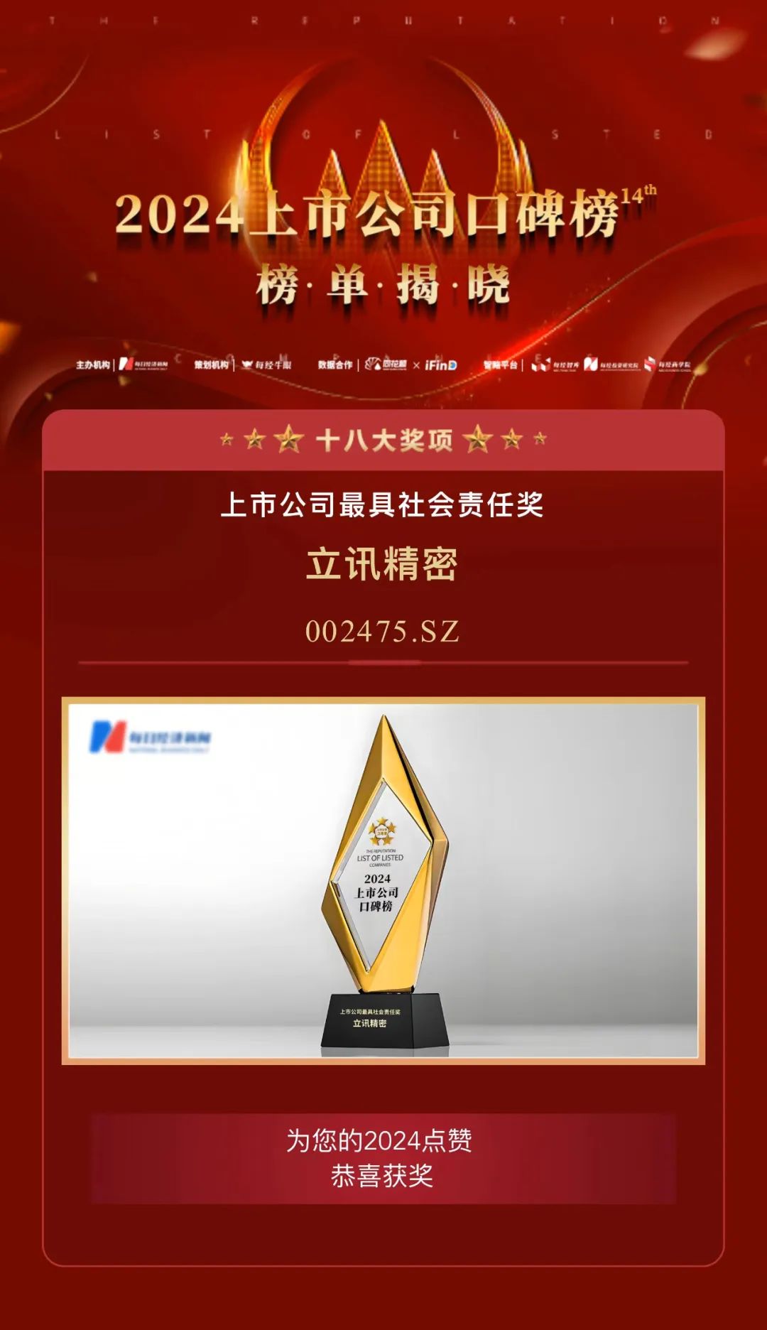 12月6日,每日經(jīng)濟新聞隆重揭榜“2024第十四屆中國上市公司口碑榜”。立訊精密成功入圍榜單并獲“上市公司20年非凡跨越獎”和“上市公司最具社會責任獎”兩大權(quán)威獎項。