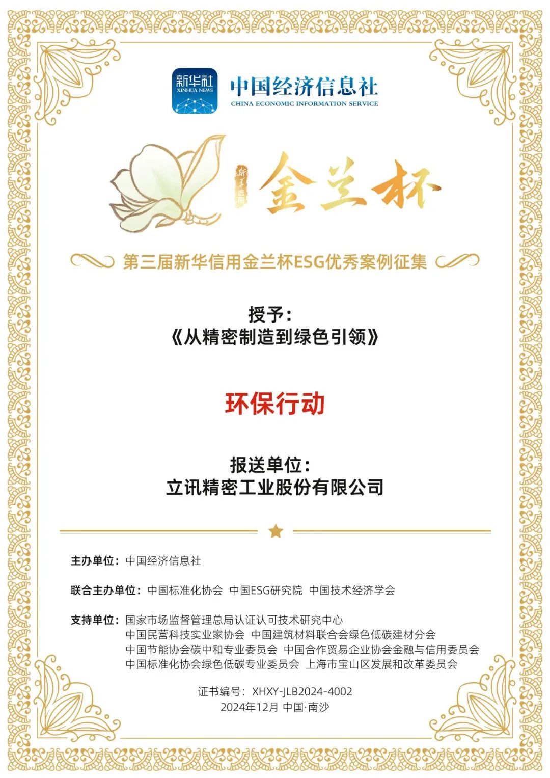 12月8日至9日,以“全球合作 綠色未來”為主題的2024年明珠灣國際氣候投融資大會在廣州舉辦,會上,第三屆新華信用金蘭杯ESG優(yōu)秀案例名單正式發(fā)布。立訊精密申報的《從精密制造到綠色引領》案例,憑借在低碳環(huán)保方面的卓越實踐與成果,成功入選新華信用金蘭杯—環(huán)保行動優(yōu)秀案例。