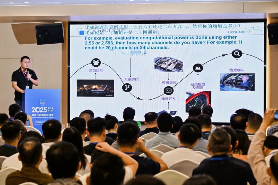 立訊精密高級經理魏鵬江博士以《聲學仿真在汽車音響設計中的應用》為題發(fā)表演講,結合車載音頻領域的前沿需求,與現(xiàn)場專家學者展開深度交流與探討,充分展現(xiàn)了立訊精密在車載音頻系統(tǒng)設計方面的技術積累與創(chuàng)新能力。